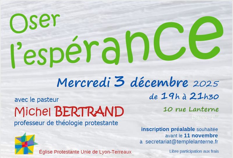 « Oser l’espérance », tel est le thème de la conférence que nous proposons pour le mercredi 3 décembre à 19h, une façon de vivre le temps de l’Avent sous le signe de l’espérance.